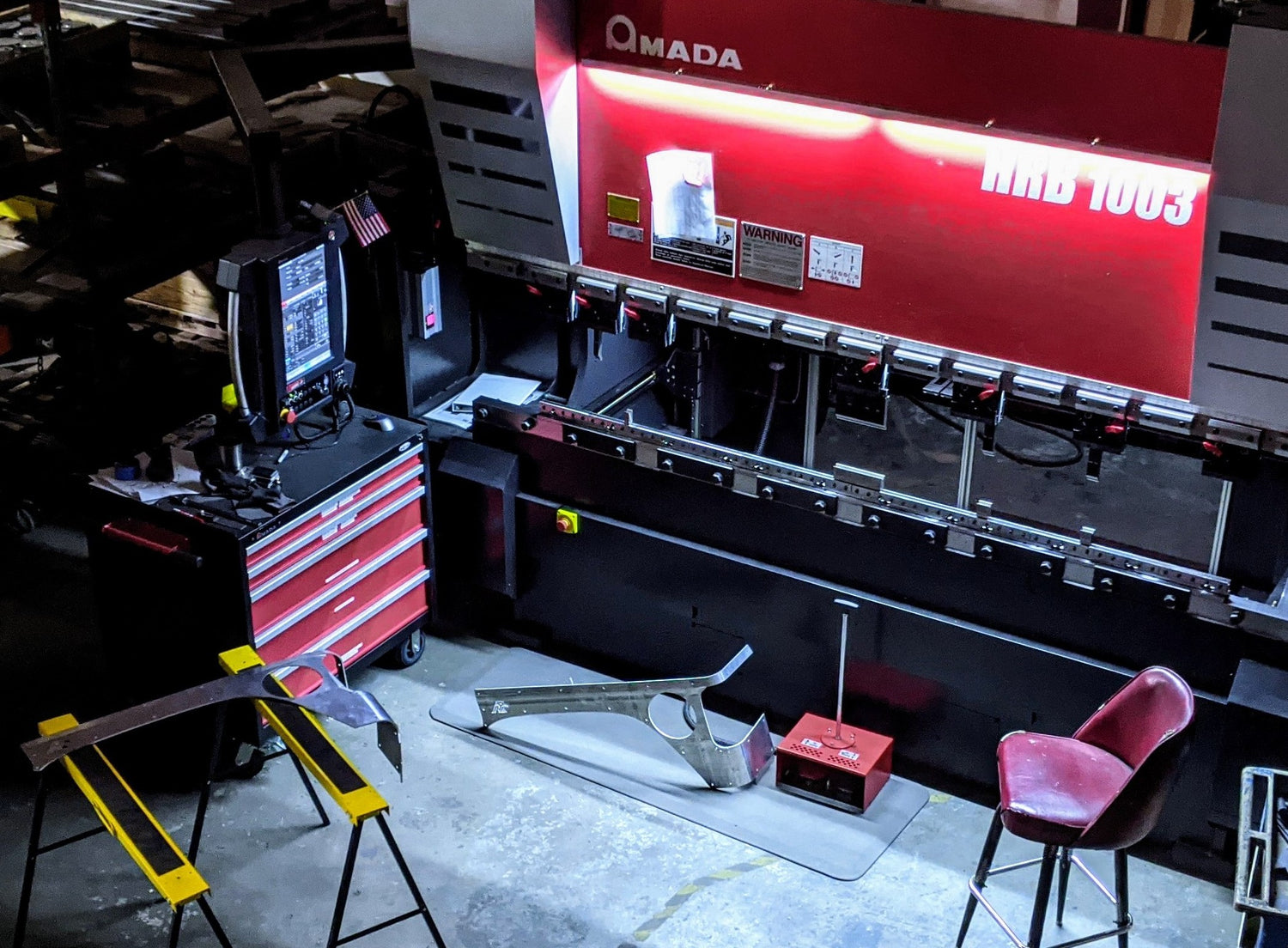 Our HRB 1003 Amada CNC Press Brake is rated to 110 US tons, and has a 10 foot bed. Our tooling is mostly centered around processing 16 gauge to 1/4" thick material, however we have dies ranging in openings from 16mm to 80mm. Not sure what that means for your project? Contact us.
